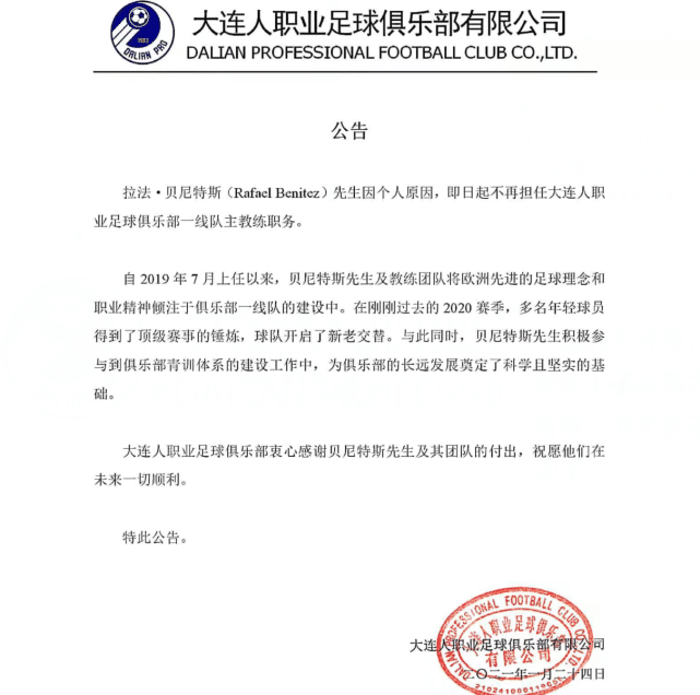 JRS直播网1月24日讯 那个男人走了!中超唯一的大牌教练,贝尼特斯离别的消息,对于大连足球乃至中超联赛都是一个重击。贝尼特斯带着欧冠冠军,皇马、利物浦、切尔西和国际米兰顶级名帅的头衔来到中超,带领大“更新换代”的大连人队披荆斩棘。此刻,他离开了,原因有很多,贝尼特斯说:疫情改变了自己和俱乐部的计划,但从今天开始他选择离开,也感谢在大连人队帮助过他的人。