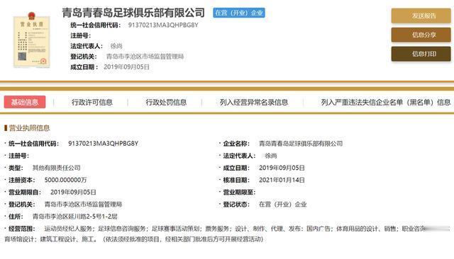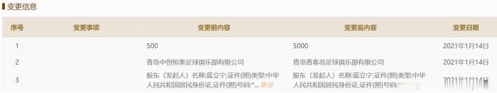 JRS直播网1月16日讯 据国家企业信用信息公示系统现实,青岛中创恒泰已正式改名为青岛青春岛足球俱乐部有限公司。
