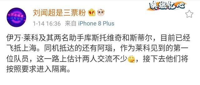 刘闻超在个人微博中写道:“伊万·莱科及其两名助手库斯托维奇和斯蒂尔,目前已经飞抵上海。同机抵达的还有阿瑙,作为莱科见到的第一位队员,这一路上估计两人交流不少,接下去他们将按照要求进入隔离。 ”