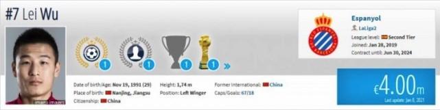 JRS直播网1月9日讯 北京时间1月9日下午,德国《转会市场》更新了西乙球员的最新身价。而在中国球迷最关注的效力于西班牙人队的中国国脚武磊,身价再次下跌。目前武磊的最新身价为400万欧元,1年内已经“暴跌”600万欧元。