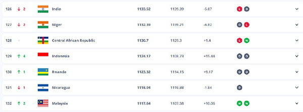 也正是凭借如此出色的表现,印尼男足获得了15.44个FIFA积分,本期世界排名从第133名上升到第129名,近4年内印尼的FIFA排名已经上升了44名之多,蹿升势头相当迅猛。而由于中国男足本次排名下跌至第91位,两队差距已经越来越小。