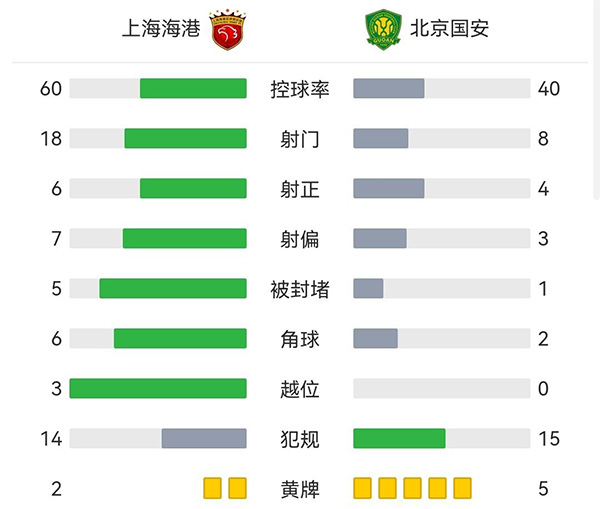 最终全场比赛结束,上海海港1-2北京国安。