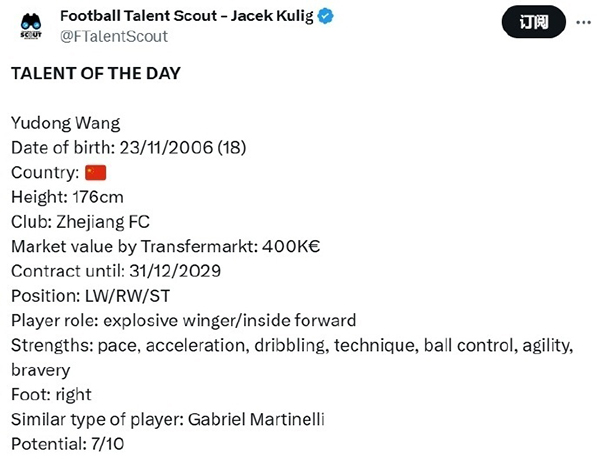 在这家权威外国球探网站的报告中,王钰栋被判定为是“爆发型边锋 / 内切型前锋”,该网站认为王钰栋的优势有7大点,分别是速度、加速、盘带、技术、控球、灵活性、勇敢。