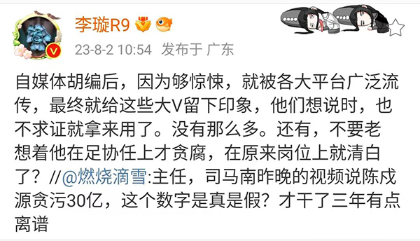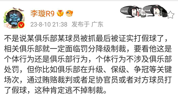 李璇也是强调:“但你比如俱乐部在升级、保级、争冠等关键场次,通过贿赂裁判或者足协官员或者对方球员打了假球,这种肯定逃不掉制裁。”所以这个事情,现在最重要的还是严俊和陈码头两个高层到底有没有干过这样的事情。值得一提的是,在此前司马南说到陈码头在足协贪污30亿的时候,李璇也是站出来回应表示:“自媒体胡编后,因为够惊悚,就被各大平台广泛流传,最终就给这些大V留下印象,他们想说时,也不求证就拿来用了。没有那么多。”李璇的话语也是曝光啊了陈码头贪污的数字肯定不是30亿。