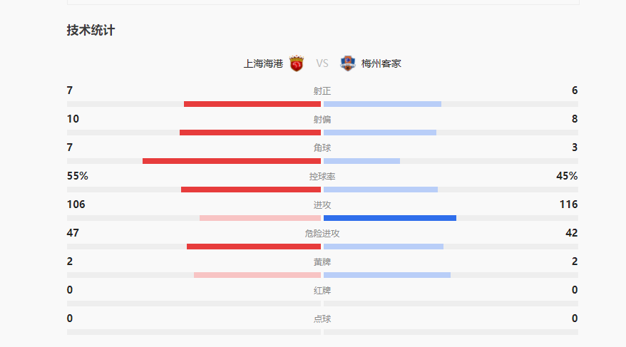 JRS直播网讯 :北京时间8月18日中超联赛第23轮,上海海港主场对阵梅州客家。上半场,双方门将屡献神扑,补时阶段武磊破门,但因越位在先被吹无效;下半场,第67分钟,梅州精彩配合,科特尼克破门,第90分钟,奥斯卡造程月磊乌龙,最终上海海港1-1梅州客家,连续两轮联赛不胜。