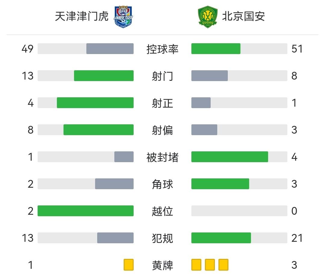 关键事件: 第11分钟,津门虎右路定位球机会梅里达主罚打在横梁上弹出,国安逃过一劫。