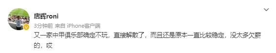 又一家中甲俱乐部确定不玩,直接解散了,而且还是原本一直比较稳定,没太多欠薪的,哎。