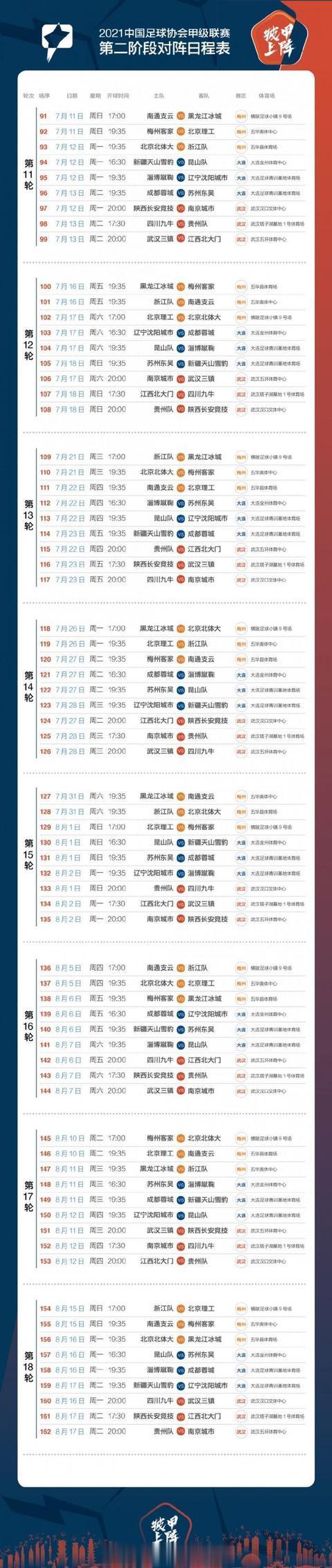 官方:中甲第二阶段在7月11日至8月17日进行