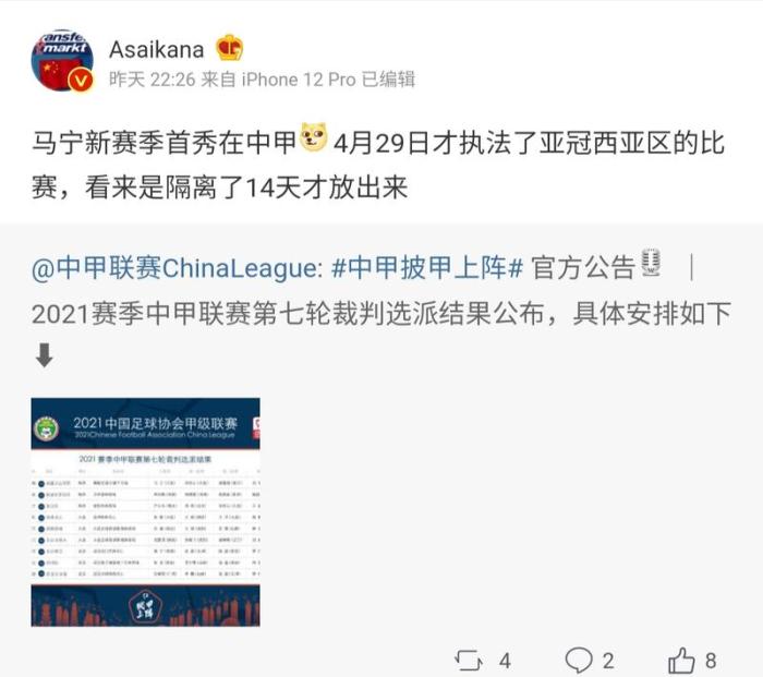 由于执法亚冠赛事,马宁缺席了中超前5轮、中甲前6轮的比赛执法。德转朱艺表示:“马宁新赛季首秀在中甲,4月29日才执法了亚冠西亚区的比赛,看来是隔离了14天才放出来。”