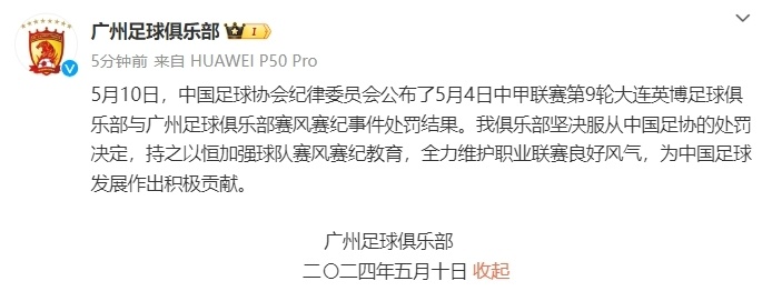 JRS直播网讯 北京时间5月10日,中甲广州俱乐部官方发布公告,回应足协处罚广州队门将霍深坪。广州俱乐部在公告中表示,俱乐部坚决服从中国足协的处罚决定,将持之以恒加强球队赛风赛纪教育,全力维护职业联赛良好风气,为中国足球发展作出积极贡献。