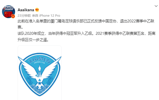 朱艺表示:“此前在准入名单里的厦门鹭岛足球俱乐部已正式反馈中国足协,退出2022赛季中乙联赛。”
