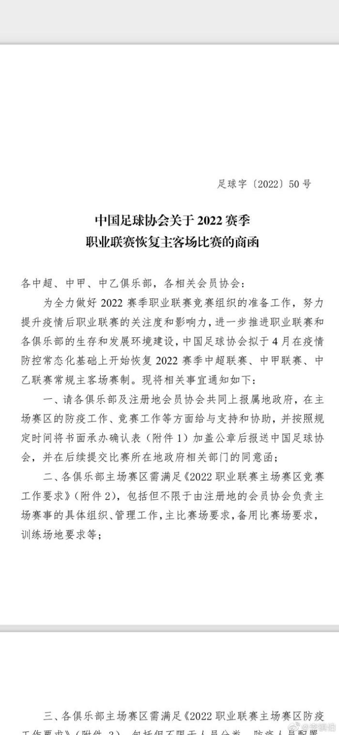 中国足球协会关于2022赛季职业联赛恢复主客场比赛的商函