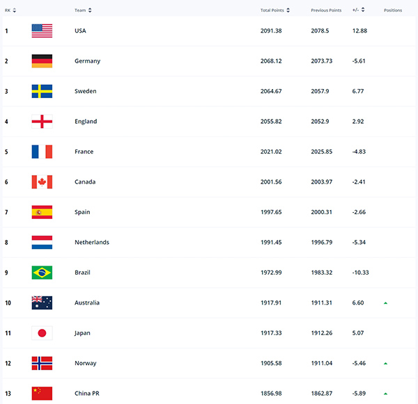 JRS直播网讯03月24日,FIFA公布了最新一期女足世界排名,中国女足升至世界第13,亚足联排名落后澳大利亚和日本,排在第3位 。世界杯同组对手英格兰第4,丹麦第15,海地第53。