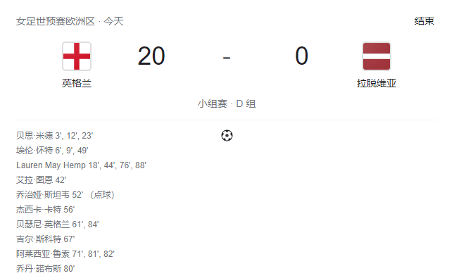 杀疯了!英格兰女足世预赛20-0大胜对手