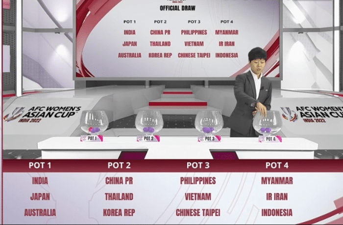 JRS直播网10月28日讯 ,2022女足亚洲杯分组抽签仪式举行,此前进行的女足亚洲杯的比赛已经决出了12强,12支晋级的球队分别是印度队,澳大利亚队,中国队,中国台北,印度尼西亚,伊朗队,日本队,韩国队,缅甸队,菲律宾队,泰国队,越南队,本次女足亚洲杯女足的比赛将会在印度举行。