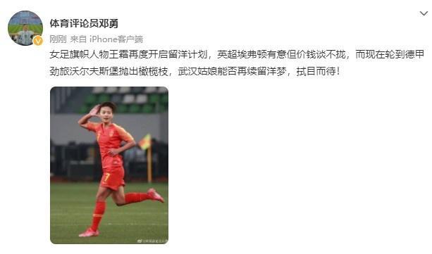 邓勇在其微博上写道:“女足旗帜人物王霜再度开启留洋计划,英超埃弗顿有意但价钱谈不拢,而现在轮到德甲劲旅沃尔夫斯堡抛出橄榄枝,武汉姑娘能否再续留洋梦,拭目而待!”