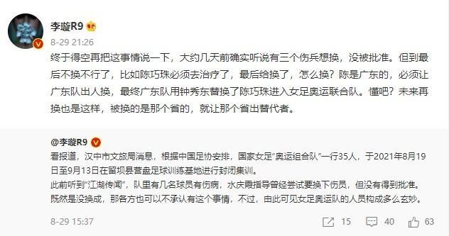 JRS直播网8月30日讯 今日,记者李璇发博,如今正在备战全运会的国家女足中有几名伤员,而水庆霞指导曾经尝试要替换伤员,但没有得到批准。