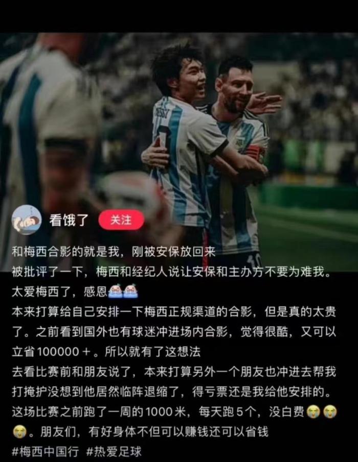 “看饿了”表示:自己本来想要通过正规渠道和梅西合影,可是因为费用要10万+,再加上想到国外也有球迷冲到场地的举动很苦所以就有了这个想法。