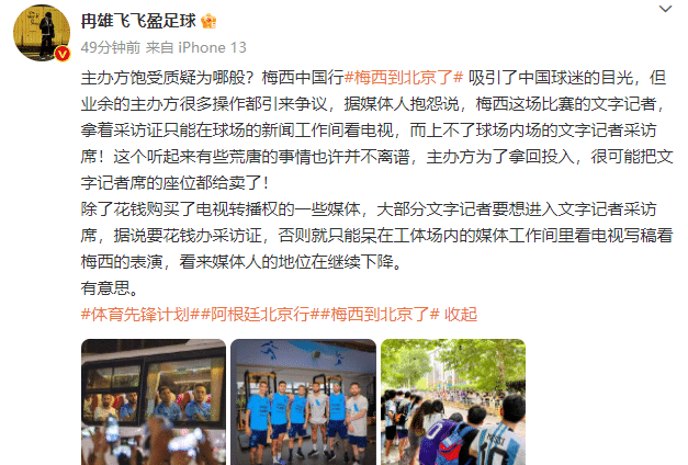 “梅西这场比赛的文字记者,拿着采访证只能在球场的新闻工作间看电视,而上不了球场内场的文字记者采访席!这个听起来有些荒唐的事情也许并不离谱,主办方为了拿回投入,很可能把文字记者席的座位都给卖了!除了花钱购买了电视转播权的一些媒体,大部分文字记者要想进入文字记者采访席,据说要花钱办采访证,否则就只能呆在工体场内的媒体工作间里看电视写稿看梅西的表演,看来媒体人的地位在继续下降。”