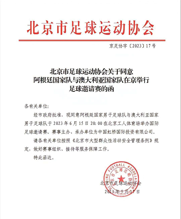 经市政府批准,现同意阿根廷国家男子足球队与澳大利亚国家男子足球队于2023年6月15日20:00在北京工人体育场举办国际足球邀请赛。赛事主办、承办单位为中国虹桥国际投资有限公司。