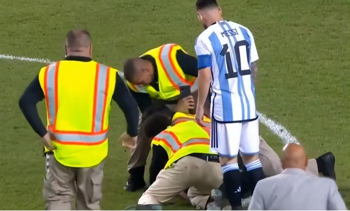 下半场的比赛全场球迷高呼梅西的名字,比赛第54分钟,在球迷的千呼万唤中,梅西终于替补登场,全场球迷爆发出了热烈的欢呼声,并且全场高呼梅西的名字,场面十分的震撼,很多人看这场比赛就是为了看到梅西,比赛第63分钟的时候,场上出现了一个小插曲,有一位球迷冲到了场内直奔梅西,多名保安人员将其按住并拉出了场外。