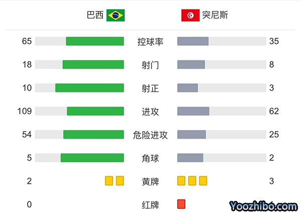 全场结束,巴西5-1击败突尼斯。