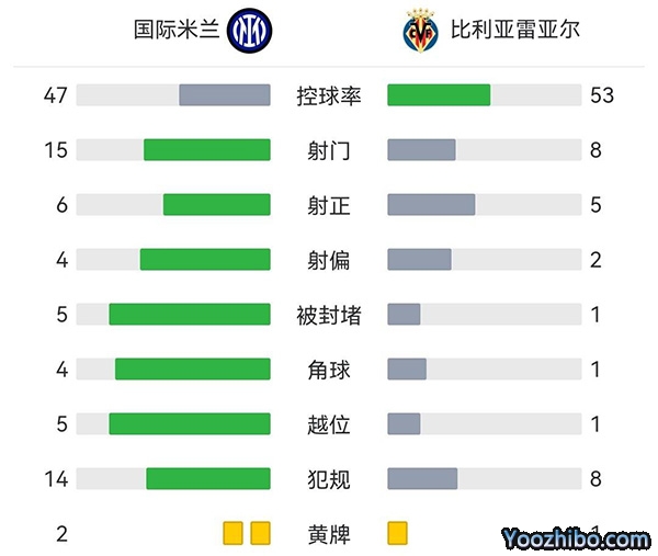 全场比赛结束,国际米兰2-4比利亚雷亚尔。