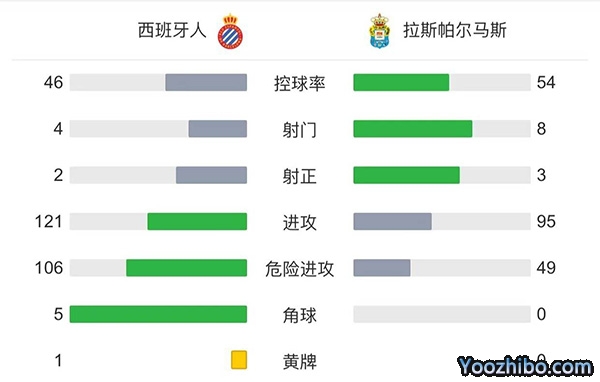全场比赛结束,最终西班牙人0-0拉斯帕尔马斯双方闷平。。