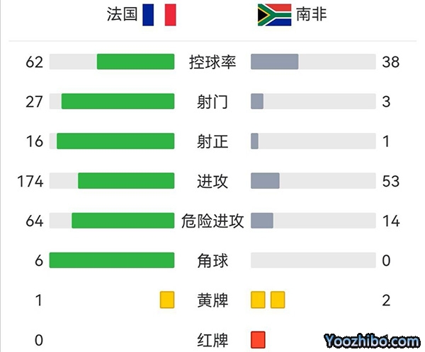 第33分钟,格列兹曼直塞,吉鲁禁区内摆脱防守球员后左脚低射得手,法国2-0南非。