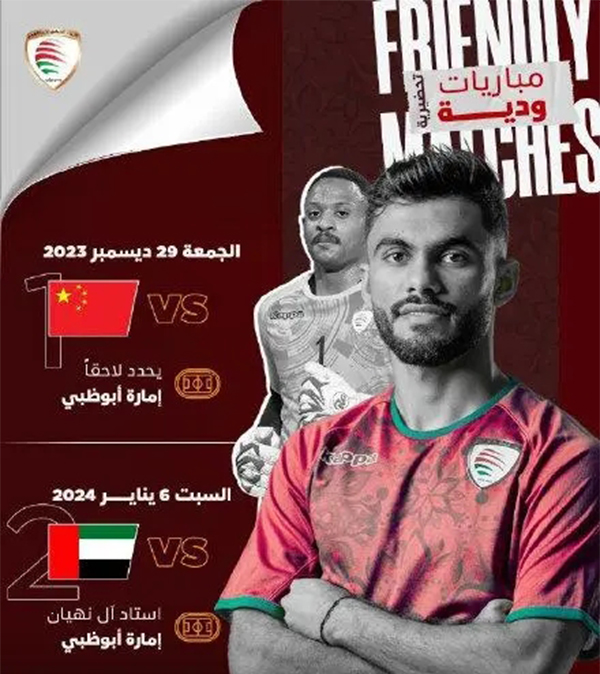 JRS直播网12月20日讯,阿曼国家队官方公布了两场热身赛的时间:12月29日阿曼将对阵中国队,1月6日阿曼对阵阿联酋队。