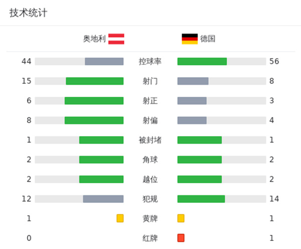 全场比赛结束,德国0-2奥地利。