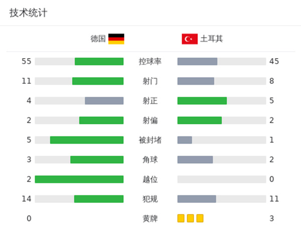 关键事件: 第5分钟,亨里希斯直塞打穿防线,萨内前插得球后倒三角传到小禁区前,哈弗茨右脚轻松推了一个死角!德国1-0土耳其↓