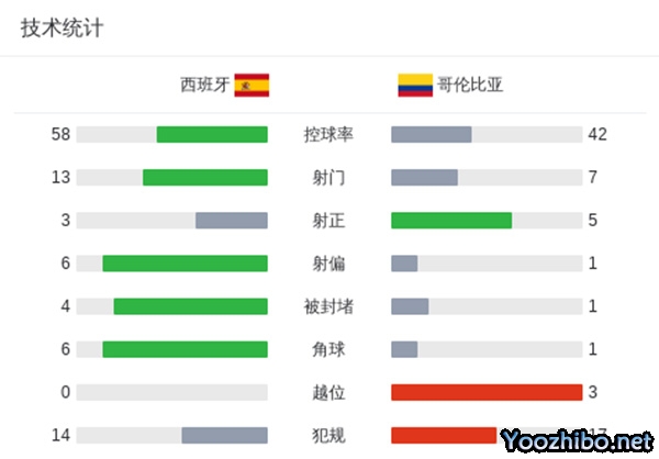 最终全场比赛结束,西班牙0-1哥伦比亚。