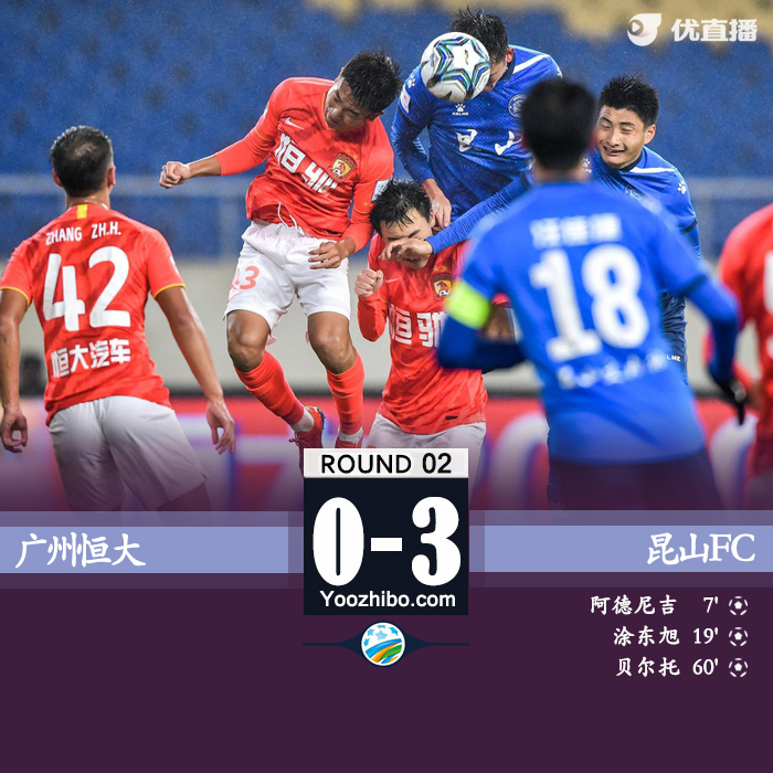 比赛第7分钟,恒大中场传球失误,昆山断球后打出快速反击,阮杨送出一脚直塞,阿德尼吉跟进破门!昆山FC1-0领先恒大。第13分钟,恒大前场一次进攻打成,皮球左路传到禁区内,廖锦涛门前包抄时没能形成打门,昆山FC门将彭鹏被踩到了右手。第18分钟,阮杨带球突破被解围出底线,昆山左侧角球传到禁区内,中路涂东旭将球顶进,昆山2-0继续扩大比分!