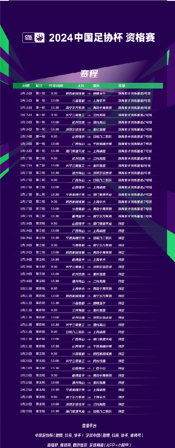 JRS直播网01月15日讯 ,中国足协杯官方消息,1月15日,2024中国足协杯资格赛将在珠海索卡训练基地开赛,18支业余球队抽签分成三组,将展开五轮角逐,向足协杯正赛发起冲击。