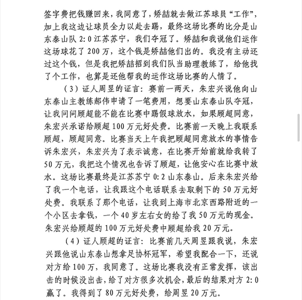 而顾超本人也在证词中承认,自己确实收钱办事,在比赛中多次“该出击时”故意不出击,没有正常发挥情况下,暗中帮助对手泰山夺冠。