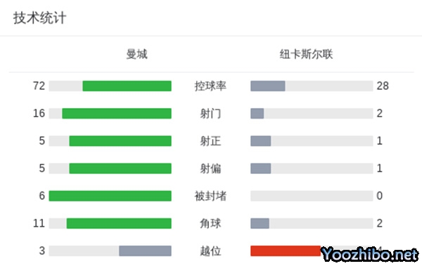 曼城2-0纽卡 B席双响奥尔特加神扑纽卡全场2射门