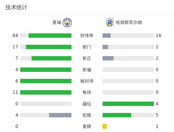 全场比赛结束,曼城5-0大胜哈德斯菲尔德晋级下一轮。