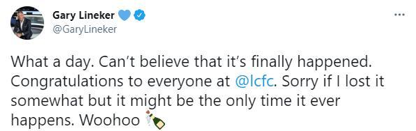 JRS直播网讯 北京时间5月16日,足总杯决赛,莱斯特城1-0小胜切尔西,夺得队史第一座足总杯冠军。赛后,莱斯特城名宿莱因克尔更新推特。