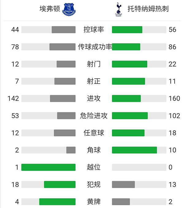 查看:埃弗顿vs热刺 全场录像技术统计: