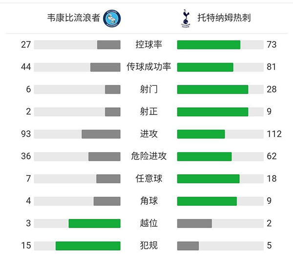 查看:韦康比流浪者vs热刺 全场录像技术统计:
