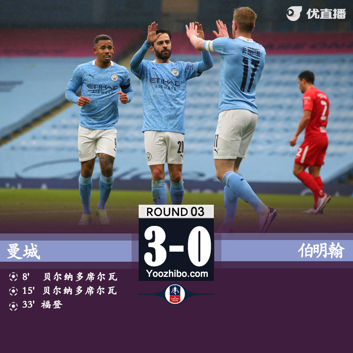 JRS直播网讯:北京时间1月10日21:30,足总杯第三轮比赛,曼城对阵伯明翰。上半场,B席开场不久就凌空抽射破门,随后接德布劳内助攻再下一城,热苏斯造险,福登贴地斩建功;下半场,热苏斯禁区内倒地但裁判没有表示,马赫雷斯破门但越位无效,曼城3-0伯明翰晋级足总杯第四轮。