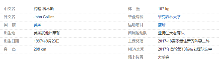 约翰·科林斯(John Collins),1997年9月23日出生于美国犹他州莱顿(Layton,Utah),美国职业篮球员动员,司职大前锋,效力于NBA亚特兰大老鹰队。