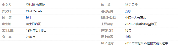 克林特·卡佩拉于2014年通过选秀进入NBA,先后效力于休斯顿火箭队以及亚特兰大老鹰队,2020-21赛季当选NBA篮板王。