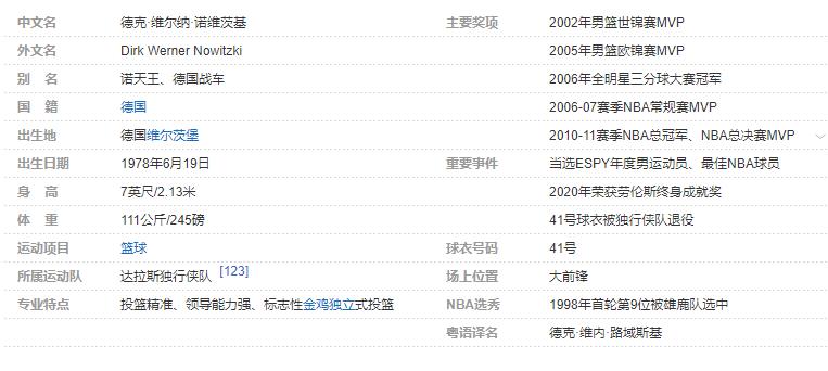 德克·诺维茨基(Dirk Nowitzki),1978年6月19日出生于德国维尔茨堡,德国职业篮球运动员,司职大前锋,绰号“诺天王”/“德国战车”,现任FIBA球员委员会主席以及达拉斯