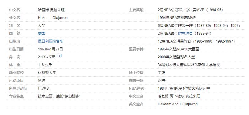 哈基姆·奥拉朱旺(Hakeem Olajuwon),1963年1月21日出生于尼日利亚拉各斯,前尼日利亚裔美国职业篮球运动员,司职中锋,绰号“大梦”(The Dream) 。