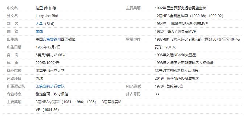 拉里·伯德(Larry Bird),1956年12月7日出生于美国印第安纳州西巴顿镇,前美国职业篮球运动员,司职小前锋/大前锋,绰号“大鸟”(Bird),现任印第安纳