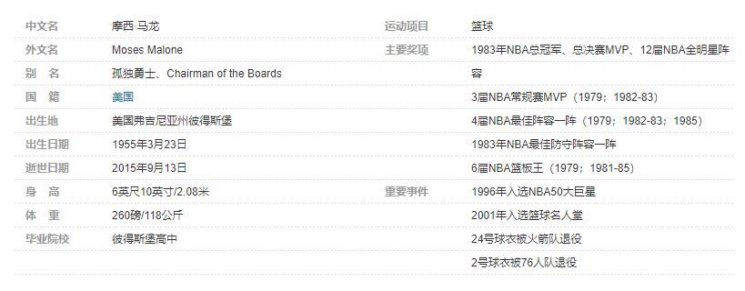 摩西·马龙(Moses Malone,1955年3月23日—2015年9月13日),出生于美国弗吉尼亚州彼得斯堡,前美国职业篮球运动员,司职中锋。