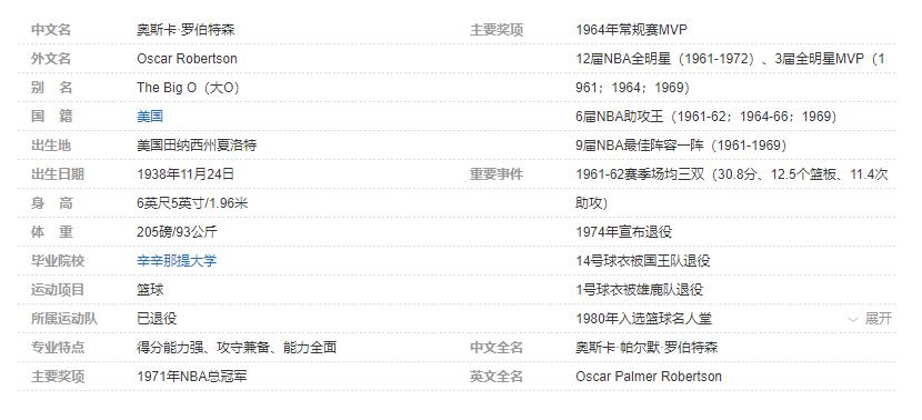 奥斯卡·罗伯特森(Oscar Robertson),1938年11月24日出生于美国田纳西州夏洛特,前美国职业篮球运动员,司职控球后卫,绰号“大O”(The Big O)。