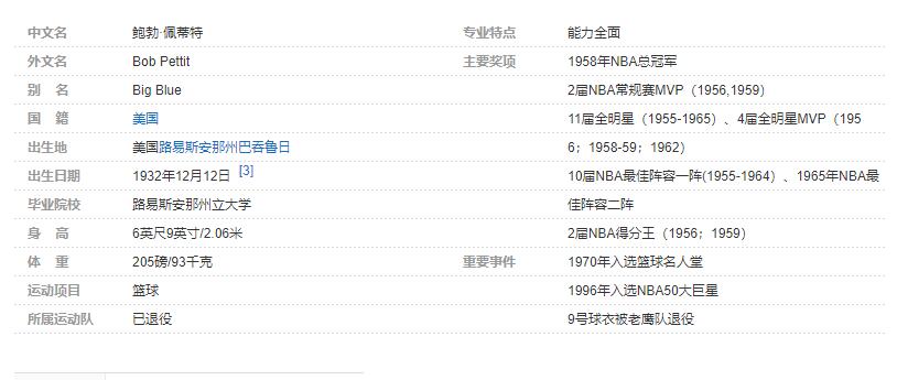 鲍勃·佩蒂特(Bob Pettit),1932年12月12日出生于美国路易斯安那州巴吞鲁日,前美国职业篮球运动员,司职大前锋/中锋。